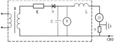 r:分流器 B:試驗(yàn)變壓器 V:靜電電壓表 CRO:高壓示波器