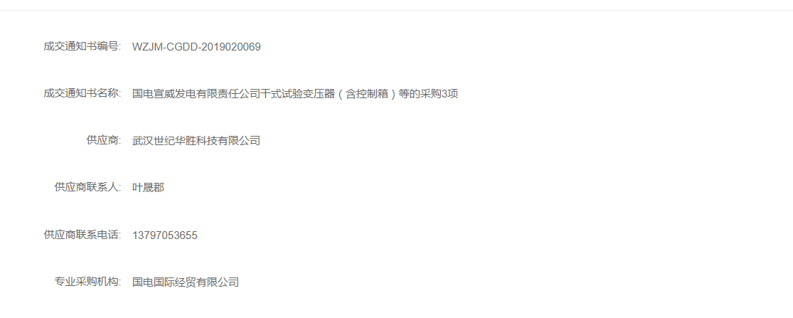 熱烈祝賀:武漢世紀(jì)華勝在國電宣威發(fā)電有限責(zé)任公司干式試驗(yàn)變壓器(含控制箱)等的采購3項(xiàng)中中標(biāo)